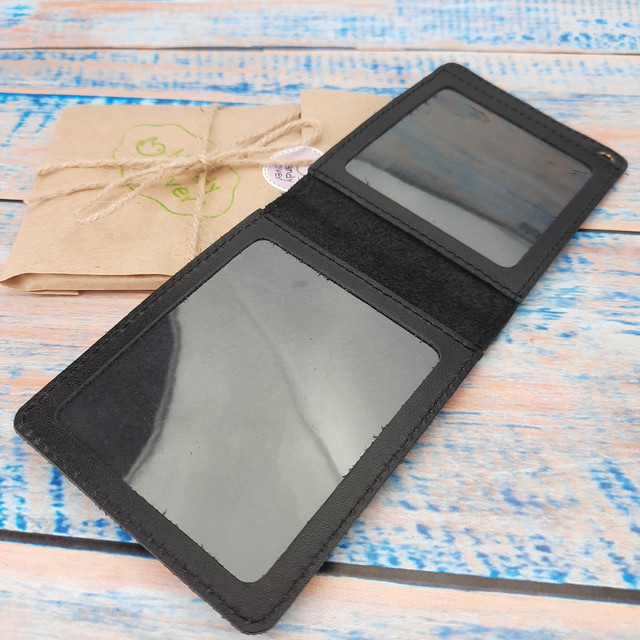 Шкіряна обкладинка на посвідчення чорна з гербом Укираїни для посвідчень різного змісту. Має вигляд книжки з прозорими кишенями. Дана модель має два прозорих відділення з міцного пластику. Є кільце для кріплення ланцюжка.