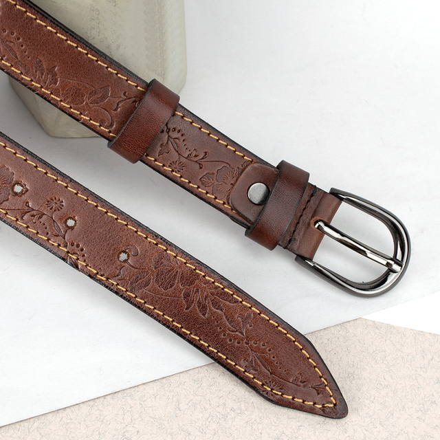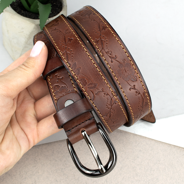 Якісний стильний ремінь з тисненим квітковим візерунком додасть цілісності і жіночності повсякденному образу, не перетягуючи на себе зайвої уваги. Виконаний з натуральної шкіри з лаконічною темною пряжкою. Такий аксесуар буде служити своїй власниці кілька років, зберігаючи свій колишній вигляд. Товар відправляється у фірмовій картонній коробці в еко-стилі, тому це прекрасний варіант для подарунка. При необхідності розмір пояса можна зменшити. В наявності можуть бути ремені більшого розміру, уточнюйте у наших менеджерів.