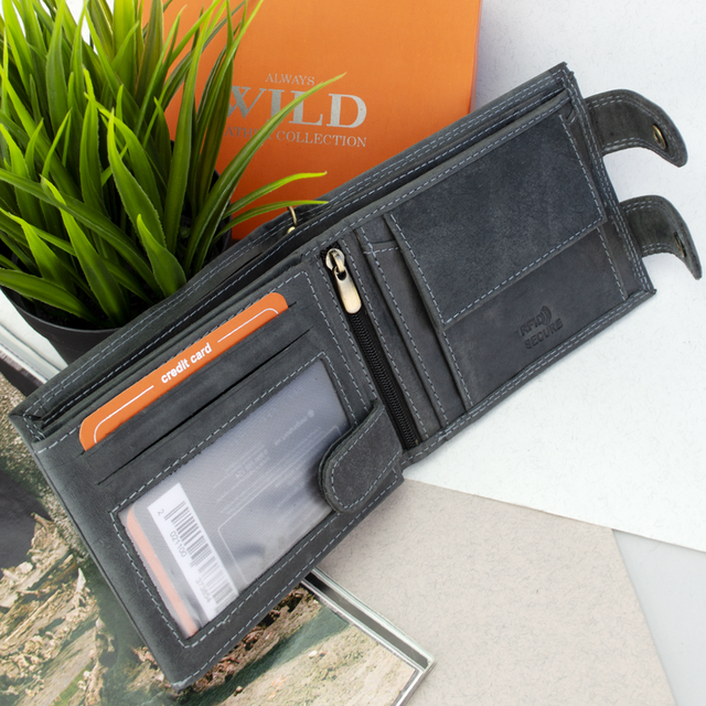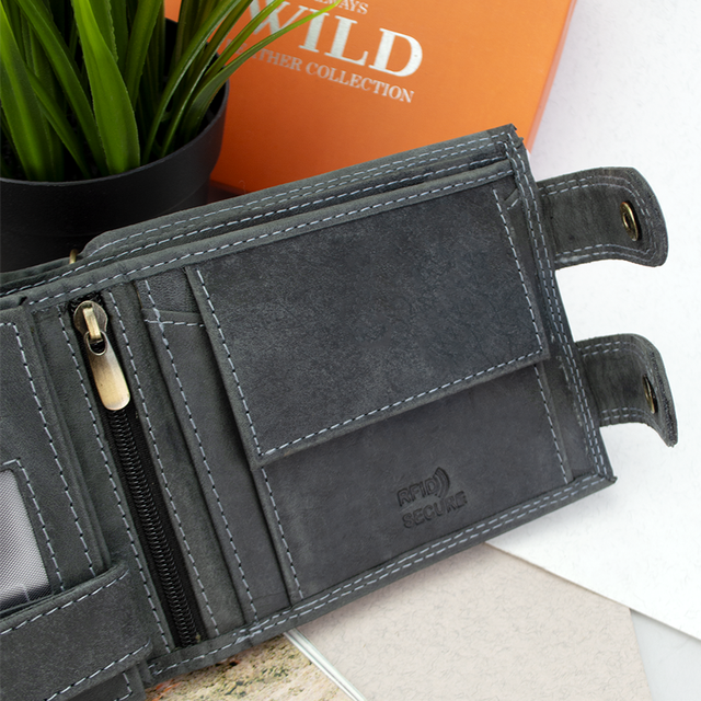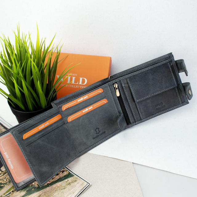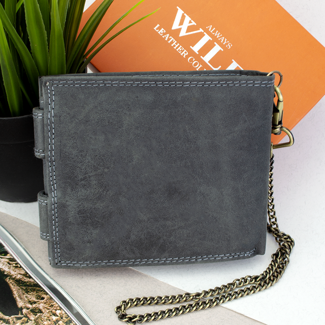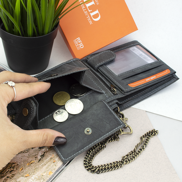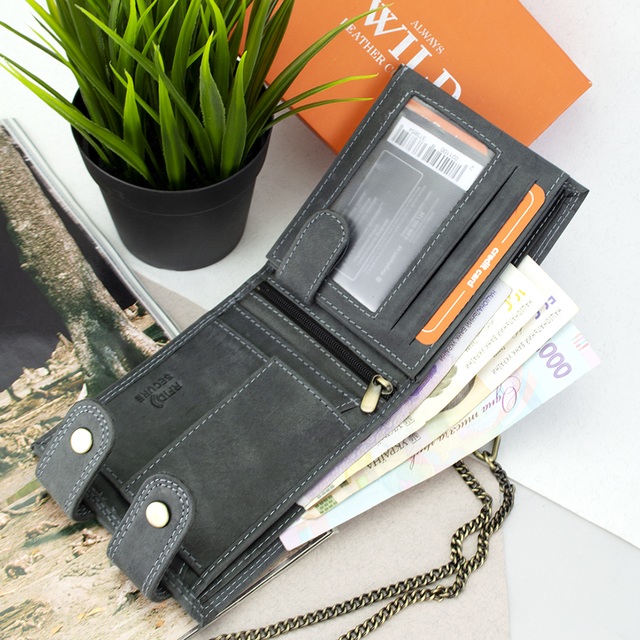 Вінтажне горизонтальне чоловіче портмоне з натуральної матової буйволиної шкіри темно-сірого кольору. Виріб виглядає дуже оригінально та стильно завдяки застібці з 2 кнопок та ланцюжку з карабіном. Це портмоне стане ідеальним подарунком любителю вінтажних речей, а також брутальному чоловікові. З таким презентом ви точно потрапите у яблучко. Купюри розміщуються у розгорнутому вигляді і не зімнуться. Портмоне застібається 2 хлястиками з кнопками, оснащене важким якісним ланцюжком, другий кінець якого можна пристебнути до шльовки джинсів. У портмоне 2 відділення для купюр (перегородки з тканини), 7 кишень для карток, 3 прозорих відділення, 1 для монет на кнопці, 1 потайна кишеня на блискавці і 2 без неї. Спеціальна тканина в підкладці забезпечує RFID захист ваших кредитних карток від електронної крадіжки.