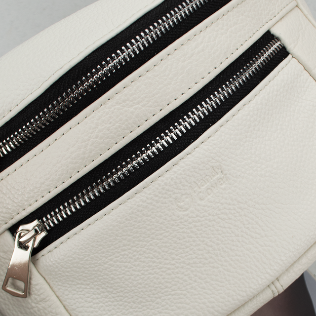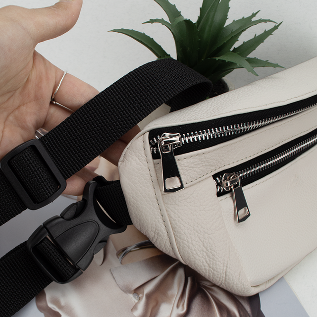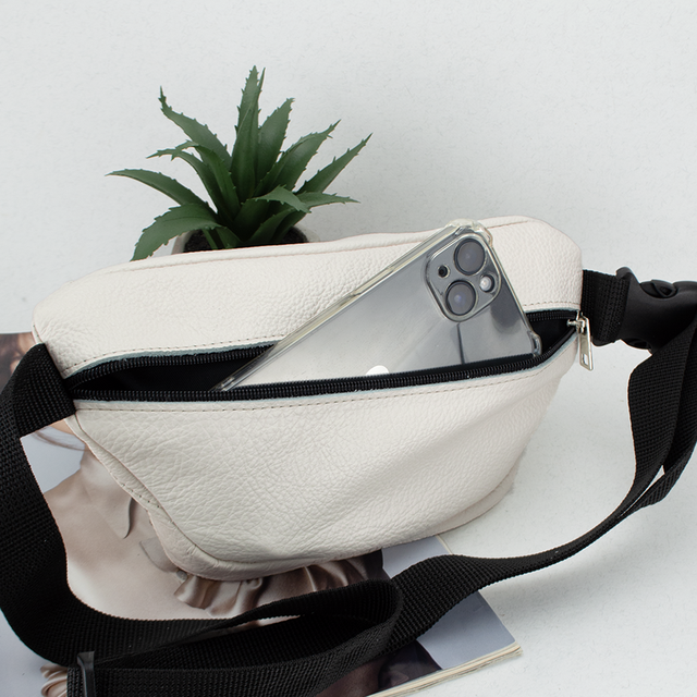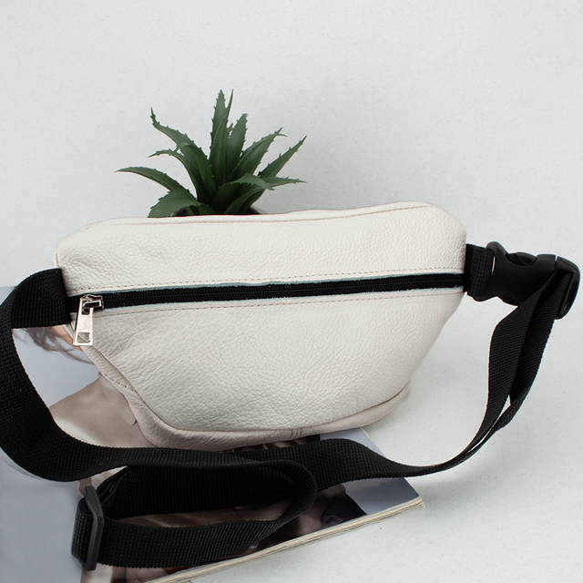 Легка, якісна та недорога сумка-бананка від українського бренду Handycover допоможе звільнити руки під час прогулянки чи повсякденних справ. Виготовлена з натуральної шкіри молочного кольору з легкою текстурою, підкладка тканинна. Бананка має основне відділення, одну кишеню на блискавці на задній стороні сумки, в якій можна розмістити телефон, а також одну невелику кишеню на лицьовій стороні сумки. В основному відділенні можна розмітити гаманець, ключі чи інші невеликі речі. Ремінь із якісної тканинної тасьми шириною 3 см фіксується надійною пластиковою застібкою - "фастексом". Лицьові блискавки металеві, на задній стороні пластикові. Діапазон регулювання ременя (разом з сумкою) - 95 см -140 см.