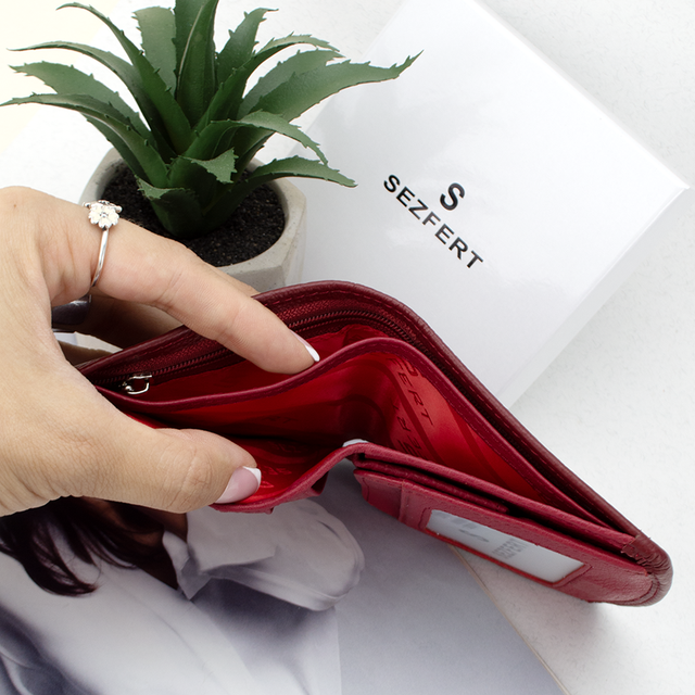 Маленький жіночий гаманець для сумочки від ТМ Sezfert (Китай). При компактних розмірах вміщує все необхідне. Гаманець має відділення: 2 відділення для купюр + 1 приховане на блискавці (входять номіналом 1000 грн включно), 3 кишені для карток, 1 прозора кишеня та велике відділення на кнопці для монет (євромонетниця). Гаманець застібається прихованим магнітом. Жіночий гаманець виготовлений із натуральної 100% матової шкіри бордового кольору.