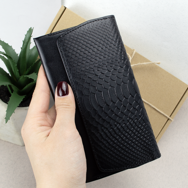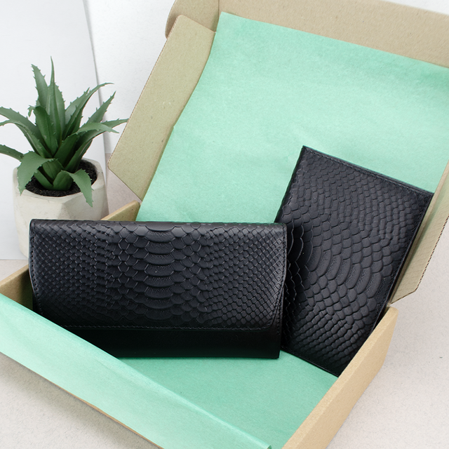 Привабливий жіночий подарунковий набір №91 - чудовий спосіб порадувати особливу жінку у вашому житті. У складі набору легкий та зручний гаманець Leona та обкладинка на паспорт, виготовлені з натуральної шкіри з тисненням під чорного пітона. Ці аксесуари додадуть неповторний шик повсякденним речам і додадуть подорожам ще більшого стилю. Гаманець Leona оснащений трьома відділеннями для купюр, п'ятьма кишенями для карток та одним прозорим відділенням. Кишеня для монет на блискавці ззовні. Застібається на кнопку, усередині фірмовий текстильний підклад. Розмір 17*9,5*2 см. Обкладинка на паспорт підкреслить індивідуальність та захистить ваші документи.