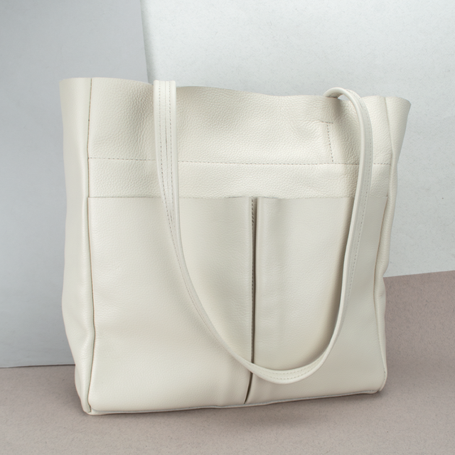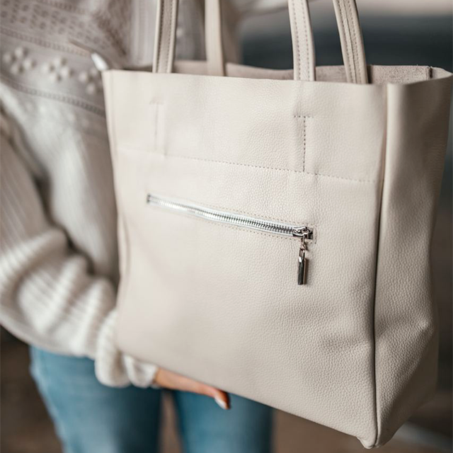 Стильний жіночий шкіряний шопер Handycover S430 у ніжному бежевому відтінку з двома зручними ручками. Цей просторий аксесуар ідеально підходить для повсякденного використання, забезпечуючи комфорт та функціональність. Зовні сумки є дві зручні кишені без застібки, де ви можете зберігати дрібні предмети, які завжди повинні бути під рукою. Сумка закривається на надійну металеву блискавку, що забезпечує безпечне зберігання ваших речей. Усередині сумки ви знайдете одне загальне відділення, яке забезпечить достатньо місця для зберігання всіх речей. Також всередині є дві зручні кишені для телефону. Потайна кишеня на блискавці та велика кишеня без застібки забезпечують зручне зберігання цінних речей та документів. На звороті сумки-шопера також розташована кишеня на блискавці, що забезпечує додаткову зручність для зберігання ваших речей.