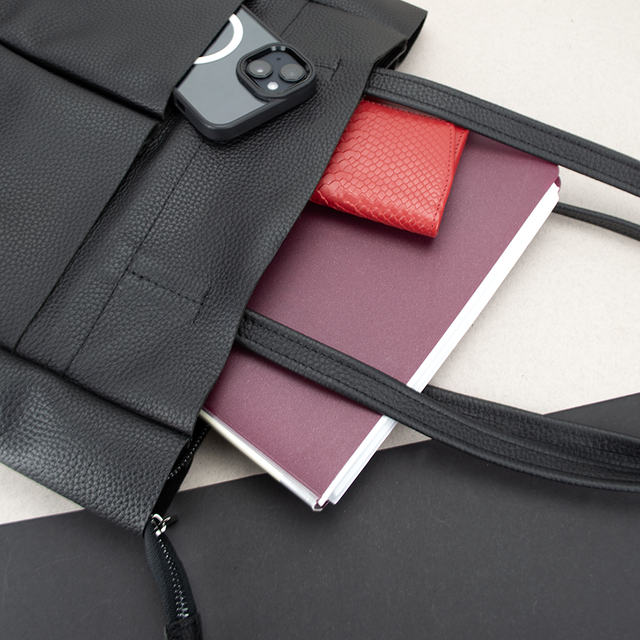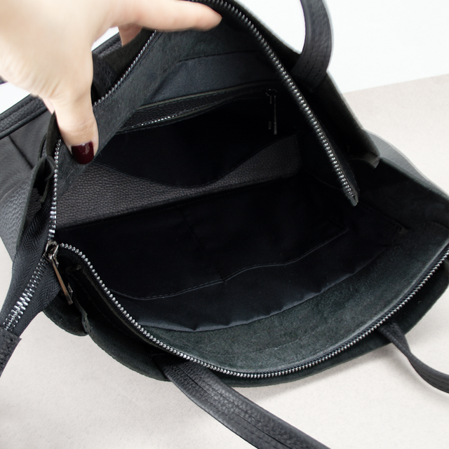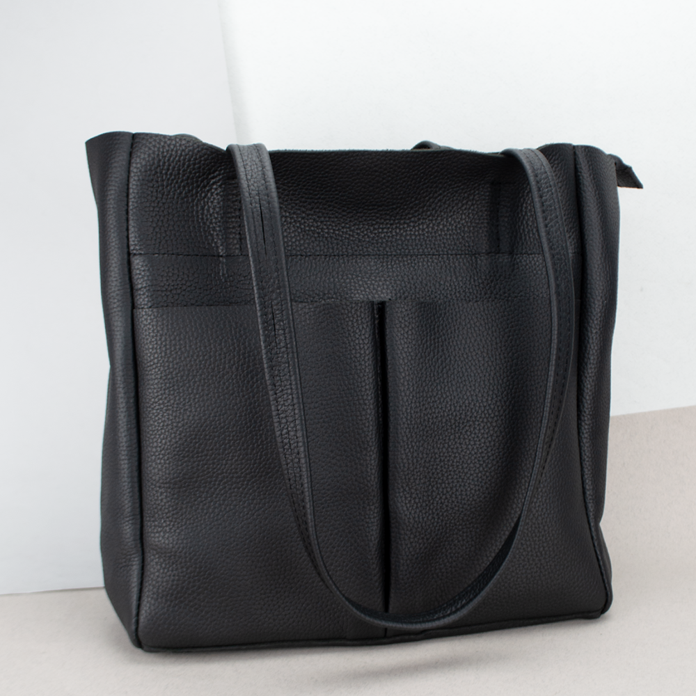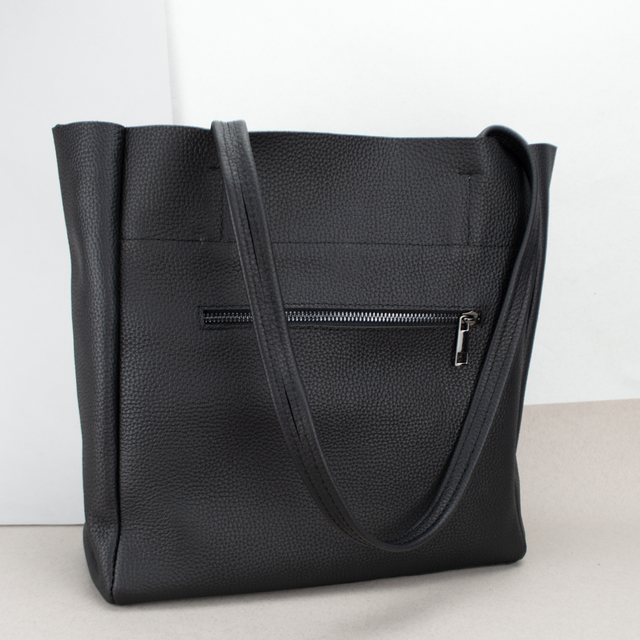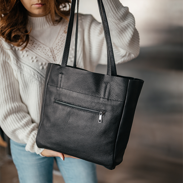 Стильний жіночий шкіряний шопер Handycover S428 у чорному кольорі з двома зручними ручками. Цей просторий аксесуар ідеально підходить для повсякденного використання, забезпечуючи комфорт та функціональність. Зовні сумки є дві зручні кишені без застібки, де ви можете зберігати дрібні предмети, які завжди повинні бути під рукою. Сумка закривається на надійну металеву блискавку, що забезпечує безпечне зберігання ваших речей. Усередині сумки ви знайдете одне загальне відділення, яке забезпечить достатньо місця для зберігання всіх речей. Також всередині є дві зручні кишені для телефону. Потайна кишеня на блискавці та велика кишеня без застібки забезпечують зручне зберігання цінних речей та документів. На звороті сумки-шопера також розташована кишеня на блискавці, що забезпечує додаткову зручність для зберігання ваших речей.