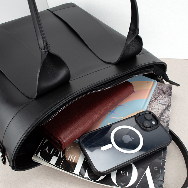 У сумки одне відділення на блискавці, всередині кишеня-перегородка на блискавці, маленька кишенька на блискавці та кишеня для телефону. Сумка дуже містка, легко розмістить MacBook, документи формату А4, книги, блокноти, косметику, гаманець, телефон, ключі.