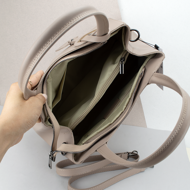 У сумки одне відділення на блискавці, всередині перегородка-кишеня на блискавці, є маленька кишенька на блискавці, дві великі кишені для телефону. Також є невелика кишеня на блискавці на задній стороні сумки. Сумка дуже містка, легко розмістить книги, блокноти, косметику, гаманець, телефон, ключі, воду.