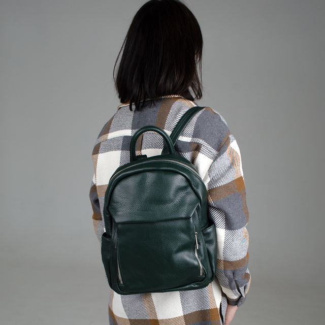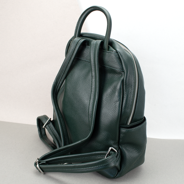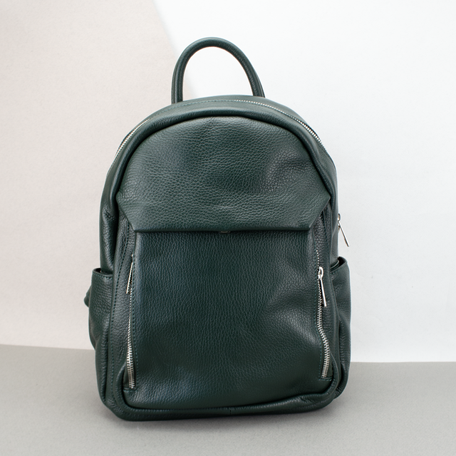 Жіночий темно-зелений рюкзак, виготовлений із натуральної шкіри з вишуканою текстурою флотар. Середній розмір ідеально підходить для повсякденного використання. Ручка для носіння в руці та дві шкіряні регульовані лямки на плече забезпечують комфорт та зручність у носінні. Зовні ви знайдете дві невеликі бічні кишені на блискавці, кишеню на магніті і дві кишені на лицьовій стороні для додаткової зручності. Внутрішній щільний текстильний підклад, кишеню на блискавці. Наш рюкзак 03729 - це поєднання стилю та практичності. Виготовлений із натуральної шкіри високої якості, він пропонує функціональні рішення для повсякденного активного життя. Стильні деталі, зручні кишені та міцна текстильна підкладка роблять цей рюкзак незамінним аксесуаром.