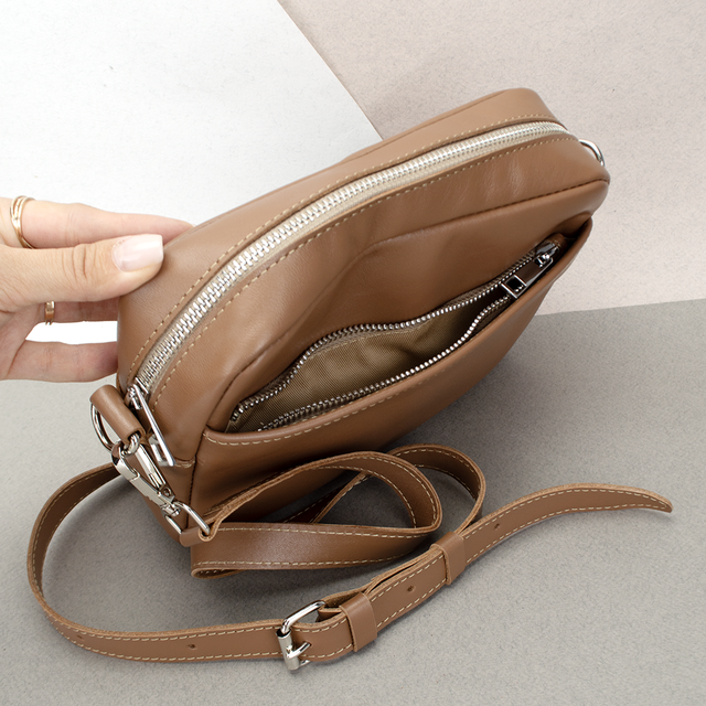 Компактна жіноча шкіряна кроссбоді сумка Handycover S497 в карамельному кольорі. Цей стильний аксесуар виготовлений із високоякісної гладенької натуральної шкіри, забезпечуючи довговічність та вишуканий зовнішній вигляд. Сумка має міцну металеву блискавку, яка гарантує безпечне зберігання ваших речей. На лицьовій та зворотній стороні є кишеня на блискавці для зручного доступу до найнеобхідніших предметів. Всередині сумки текстильна підкладка, є прихована кишеня на блискавці та кишеня для телефону. Це дозволяє легко і компактно організувати вміст сумки. Крім того, сумка оснащена шкіряним ремінцем, що знімається, з регулюванням довжини, що дозволяє носити її як через плече, так і на плечі. За бажання ремінець можна замінити на текстильний для різноманітності створення нових образів.