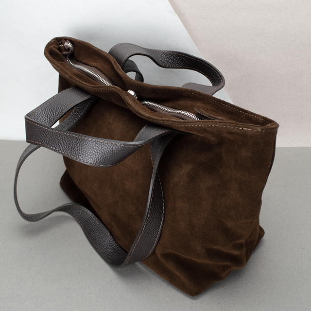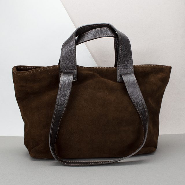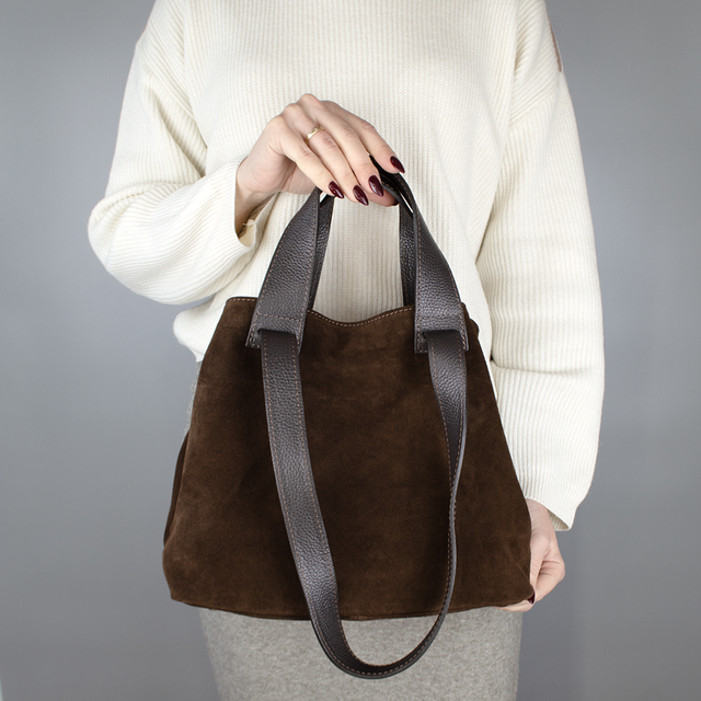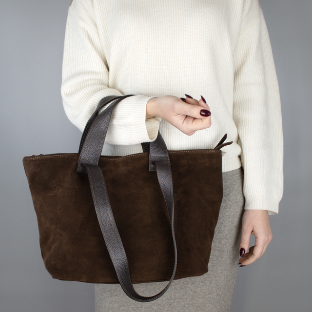 Темно-коричнева замшева сумка-шопер 03791 - чудове поєднання елегантності та функціональності. Ця сумка з натуральної замші стане ідеальним компаньйоном для вашого стильного образу.Сумка застібається на блискавку та магніт, забезпечуючи безпечне та зручне використання. Два варіанти довжини ручок – 2 короткі та 2 довгі – надають вам свободу вибору в носінні: тримайте в руці або носите на плечі.