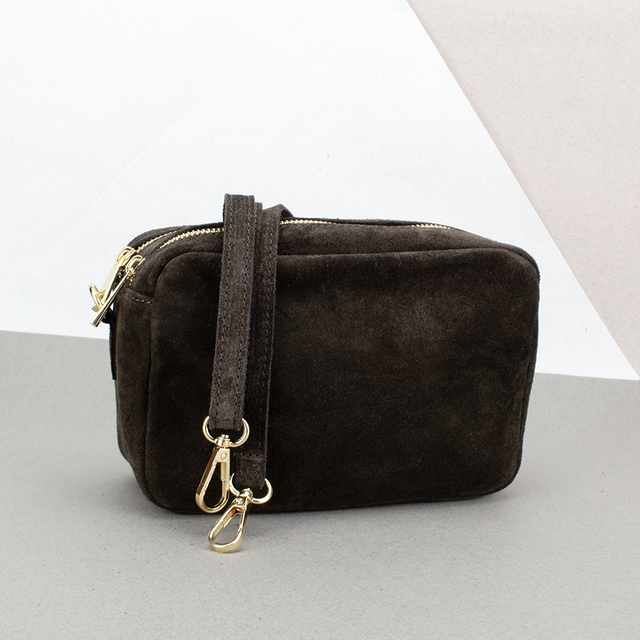 Ця компактна жіноча сумка коричневого кольору поєднує в собі елегантність і практичність. Виконана з високоякісної замші, вона має приємну на дотик текстуру та виглядає стильно і витончено. Дві окремі секції на блискавках золотистого кольору забезпечують зручний доступ до речей і допомагають організувати простір всередині.