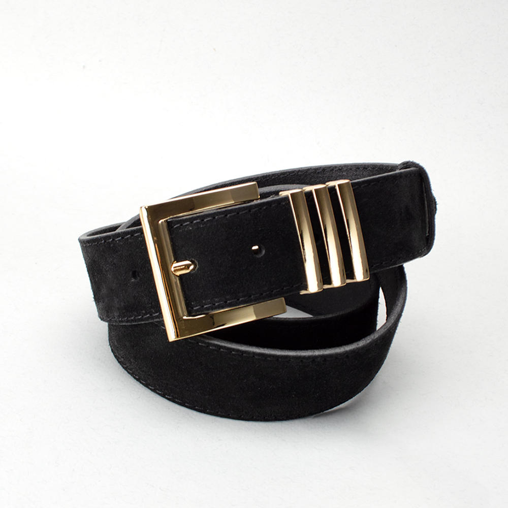 Жіночий ремінь виготовлений із натуральної замші чорного кольору, що надає йому розкішного вигляду. М’яка текстура замшу створює ефект глибини кольору, додаючи аксесуару вишуканості та особливого шарму. Пряжка ременя виготовлена з металу в благородному золотому кольорі, має класичну квадратну форму. Її блискуча поверхня створює стильний контраст із матовою текстурою замші. Декоративні елементи у вигляді трьох паралельних золотистих пластин додають ременю сучасного вигляду та підкреслюють його унікальність.