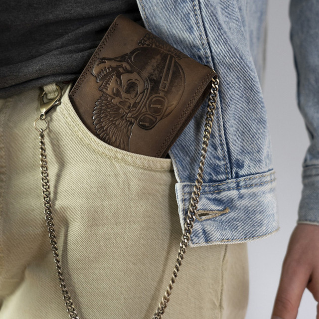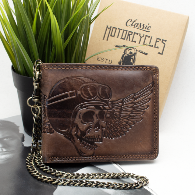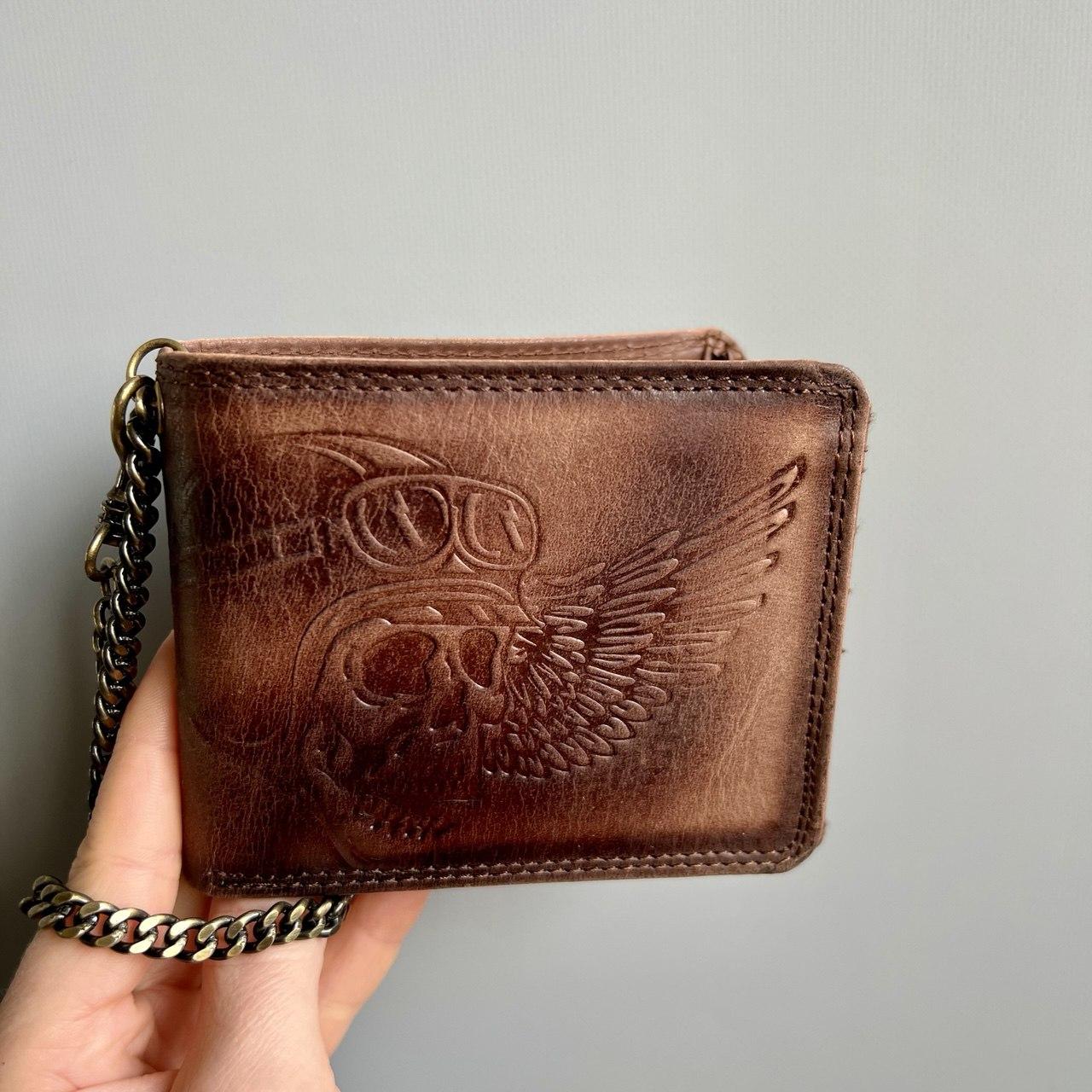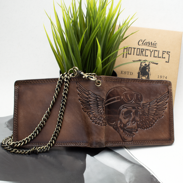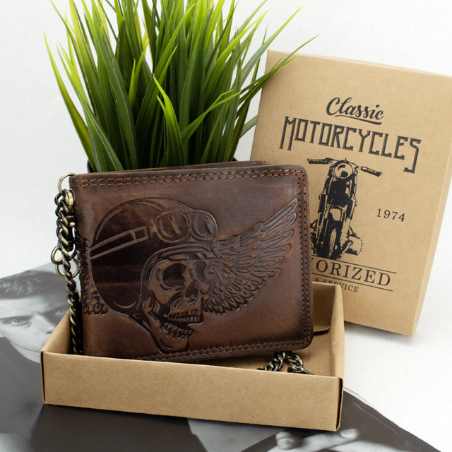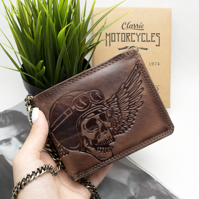 Вінтажне горизонтальне портмоне з натуральної матової шкіри. Виріб виглядає дуже оригінально та стильно завдяки витісненому зображенню черепа. Аксесуар зручно лежить у руці. Купюри поміщаються у розгорнутому вигляді та не мнуться. Дане портмоне стане ідеальним подарунком любителю вінтажних речей, а також брутальному чоловікові, мотоциклісту або байкеру. З таким презентом ви точно потрапите у яблучко. Портмоне без застібки, оснащене важким якісним ланцюжком, другий кінець якого можна пристебнути до шльовки джинсів. У портмоне 2 відділення для купюр (перегородки зі шкіри), 9 кишень для карток, 3 прозорих відділення, 1 для монет на кнопці, 1 прихована кишеня на блискавці і 2 без неї. Розмір 11,5*9,5*2,5 см. Спеціальна тканина в підкладці забезпечує RFID захист ваших кредитних карток від електронної крадіжки.