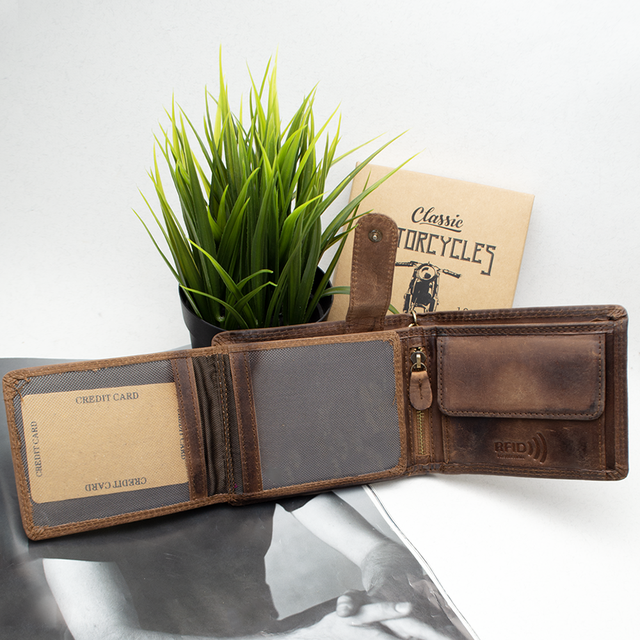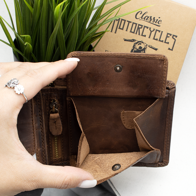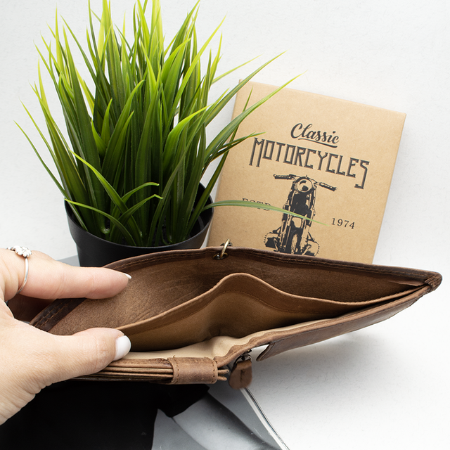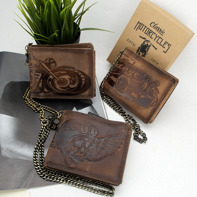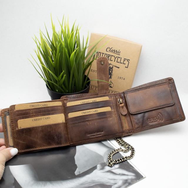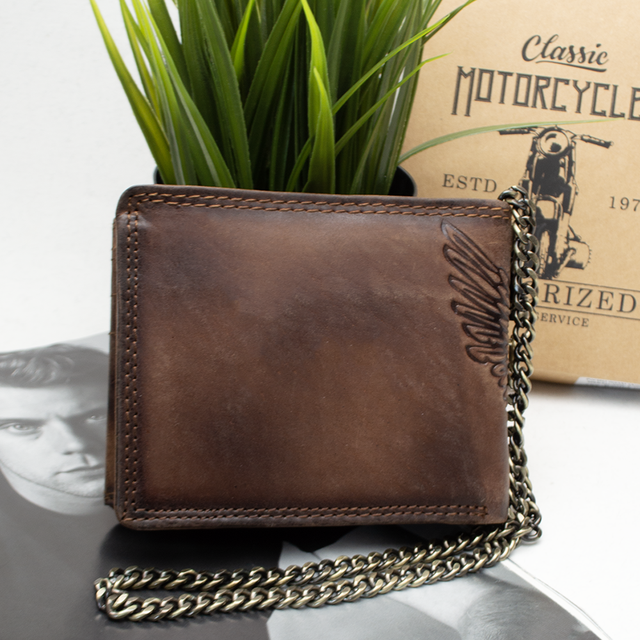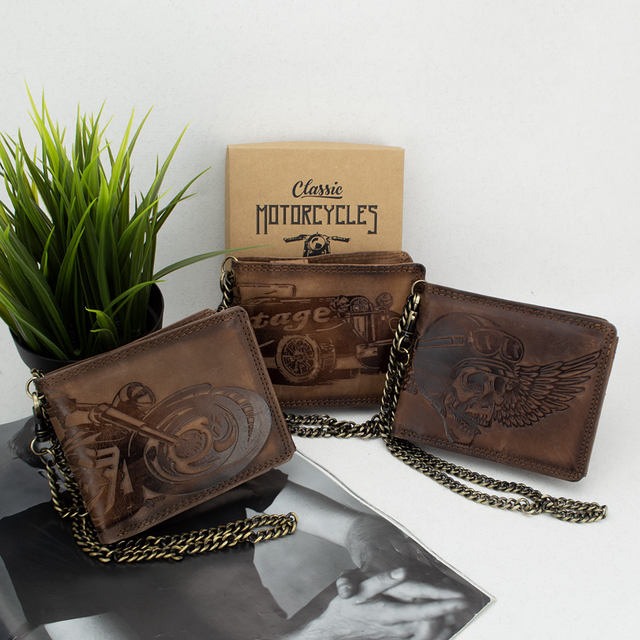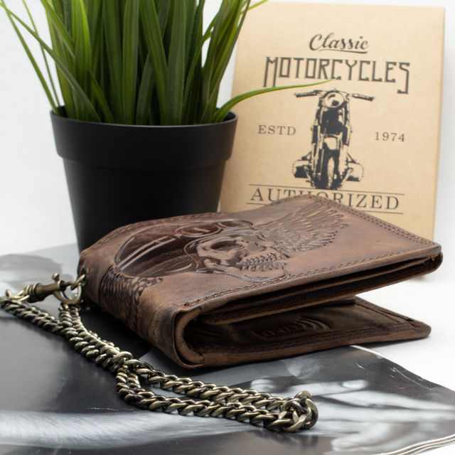 Вінтажне горизонтальне портмоне з натуральної матової шкіри. Виріб виглядає дуже оригінально та стильно завдяки витісненому зображенню черепа. Аксесуар зручно лежить у руці. Купюри поміщаються у розгорнутому вигляді та не мнуться. Дане портмоне стане ідеальним подарунком любителю вінтажних речей, а також брутальному чоловікові, мотоциклісту або байкеру. З таким презентом ви точно потрапите у яблучко. Портмоне без застібки, оснащене важким якісним ланцюжком, другий кінець якого можна пристебнути до шльовки джинсів. У портмоне 2 відділення для купюр (перегородки зі шкіри), 9 кишень для карток, 3 прозорих відділення, 1 для монет на кнопці, 1 прихована кишеня на блискавці і 2 без неї. Розмір 11,5*9,5*2,5 см. Спеціальна тканина в підкладці забезпечує RFID захист ваших кредитних карток від електронної крадіжки.